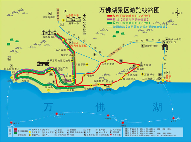 萬佛湖是一個聞名于世的湖泊型觀光旅游風景區,環湖皆山,湖面50平方公里,容水量8.2億立方米,水質達國家地表水二級甲類標準。這里一碧萬頃,波光瀲滟,綠島浮動,百鳥翔集,舟帆點點。湖中66島,已有燕子、萬佛、釣魚;風情、藏仙、雙龍等11個島嶼開發風情表演、野生動物觀賞、水上飛機等游樂項目。萬佛湖自然景觀和人文景觀眾多,有萬佛石林、摩崖石刻、海市蜃樓、幽谷新月、龍柏山道、左慈釣臺、天池、觀音洞、人頭馬、杉木林、翠竹嶺、馬尾松坡、白鷺洲、湖濱沙灘、游泳場等。世界上第一人工土石大壩-龍河口水庫大壩,就屹立于湖東大小梅山之間。亞洲鐵人三項賽和國際龍舟邀請賽曾在這里舉辦。目前,年接待游客的人次已躋身于安徽各風景名勝區前列。